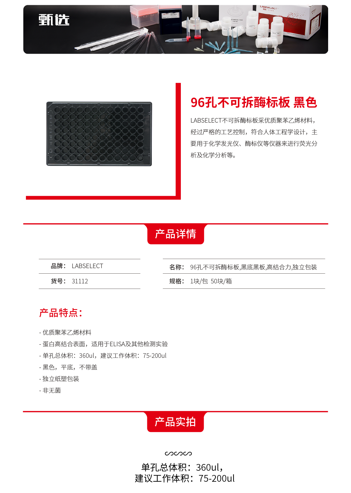 96孔不可拆酶标板,黑底黑板,高结合力,独立包装