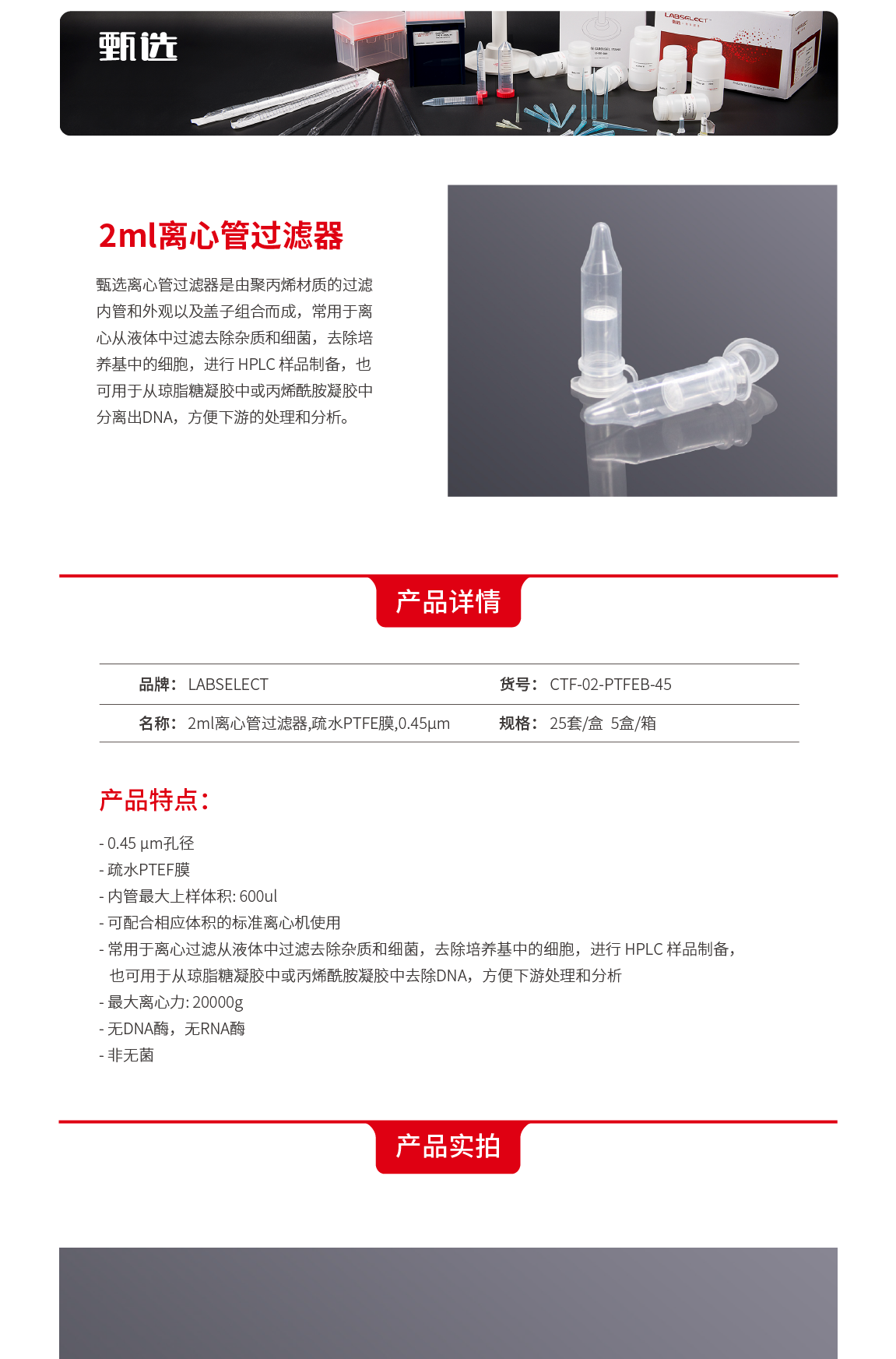 2ml离心管过滤器,疏水PTFE膜,0.45μm